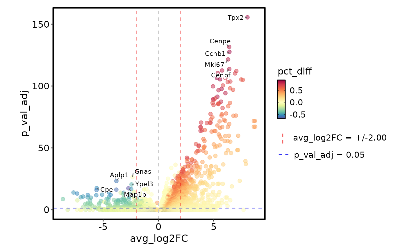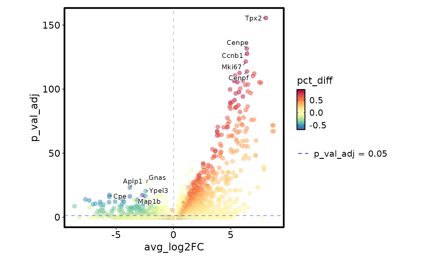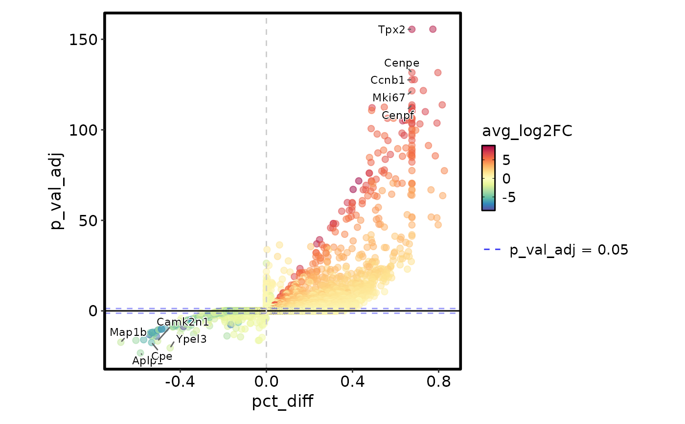 : Volcano plot with difference in percentage of cells expressing the gene between two groups on x-axis and -log10(p-value) on y-axis. Ifp_adjust