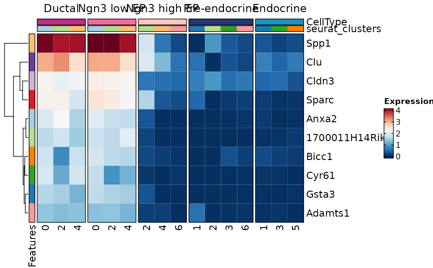 MarkersPlot(allmarkers, object = pancreas_sub, plot_type = "heatmap",