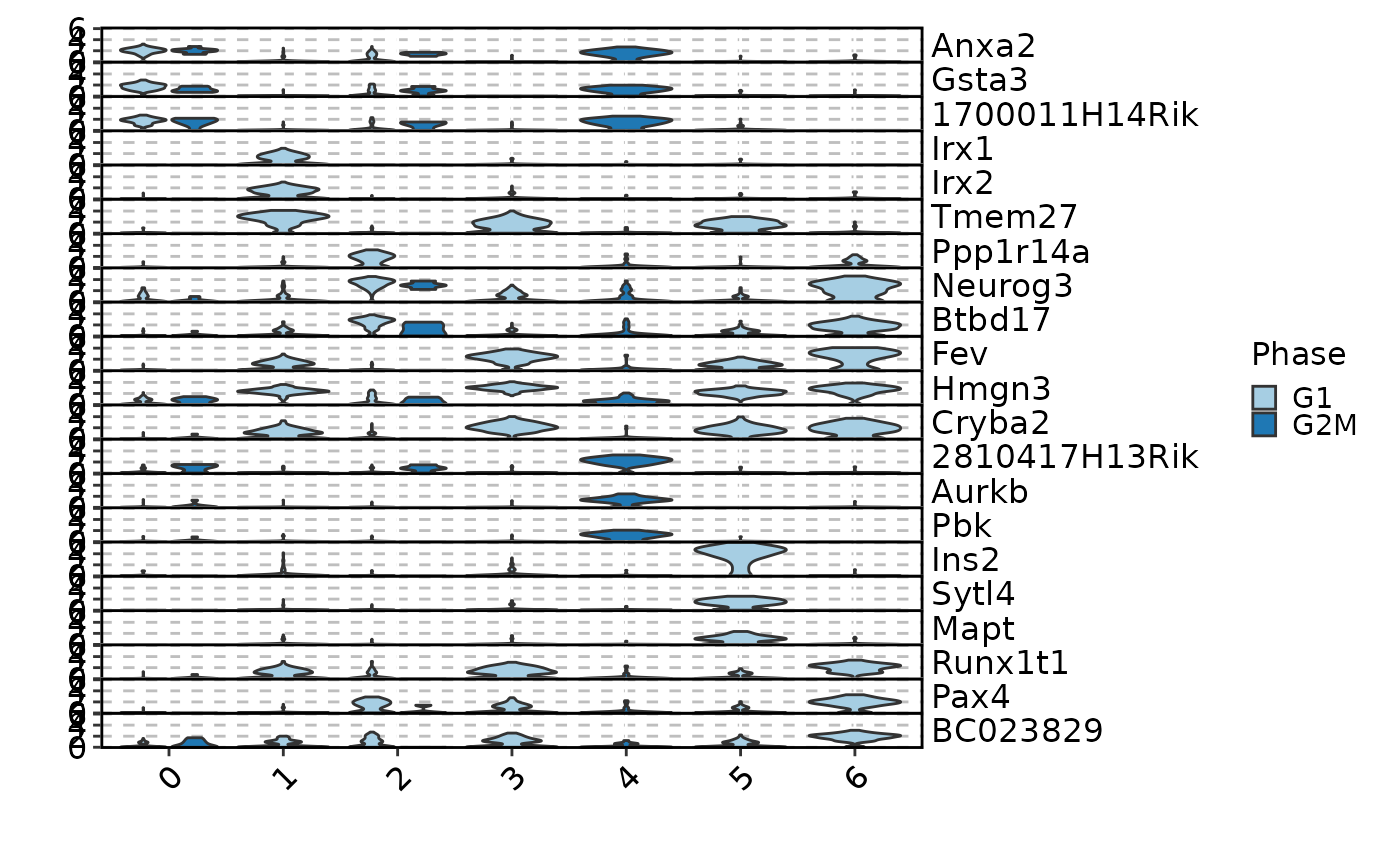 : Violin plot of expression values for each gene across groups defined bysubset_by