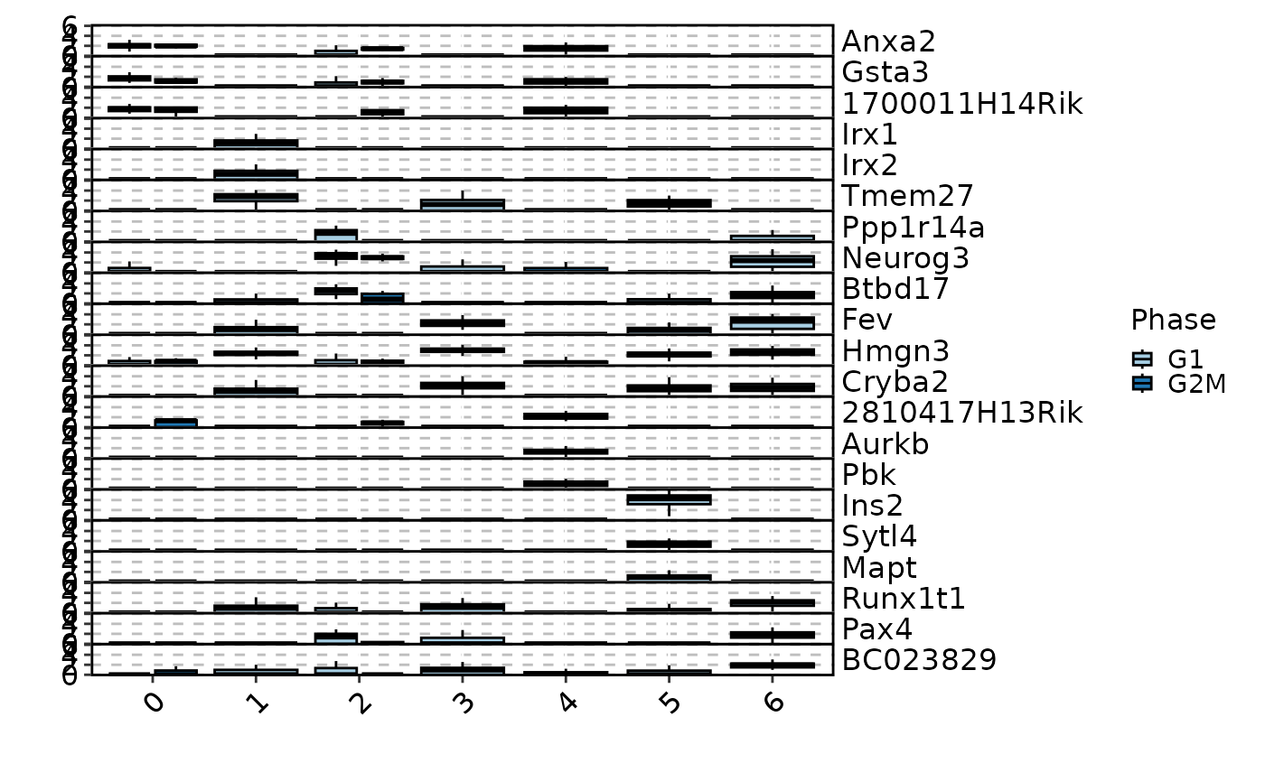 : Box plot of expression values for each gene across groups defined bysubset_by