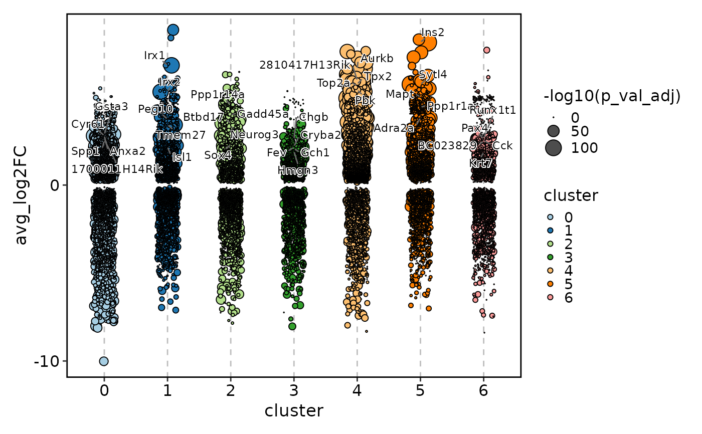 : Dot plot of log2 fold change for each gene across groups defined bysubset_by