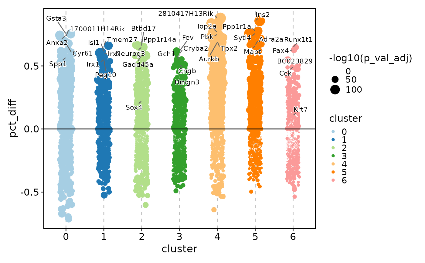 : Jitter plot of difference in percentage of cells expressing the gene between two groups for each gene. The x-axis is the groups defined bysubset_by