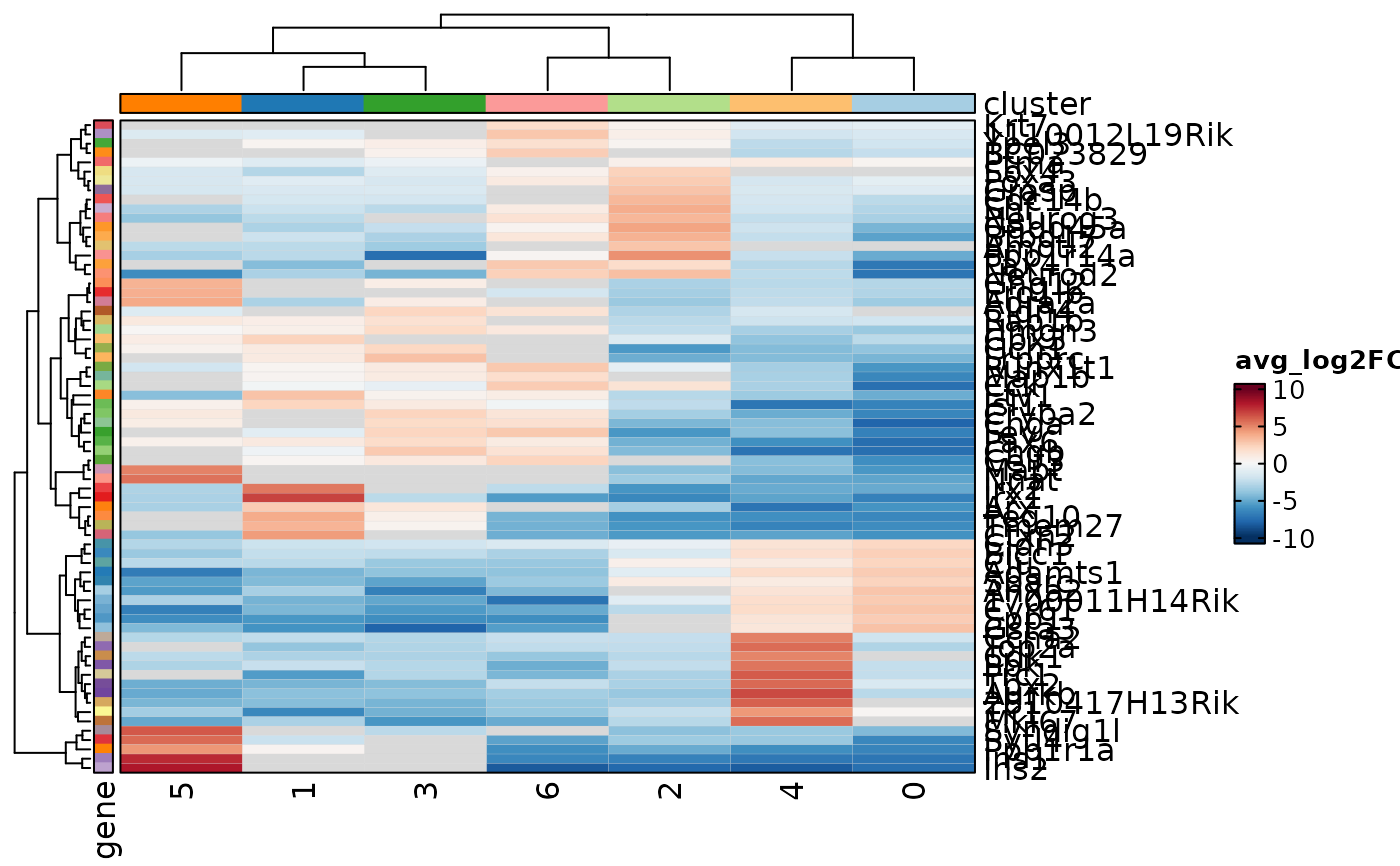 : Heatmap of log2 fold change for each gene across groups defined bysubset_by