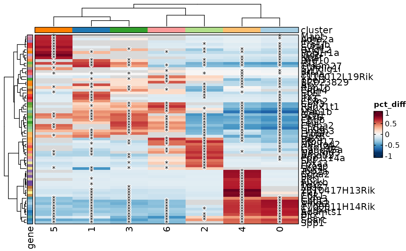 : Heatmap of difference in percentage of cells expressing the gene between two groups for each gene across groups defined bysubset_by